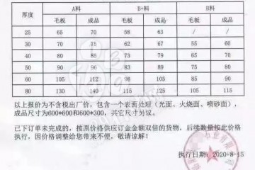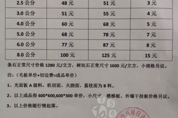某礦山加工為一體的大型石材企業發布通知:因礦山開采成本上漲,人工成本上漲,各種工廠加工成本上漲,路沿石價格上調100元每立方,板材每平方上漲2元。河南泌陽芝麻白2019年3月11日起本礦山方料調整后每立方單價…